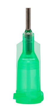 The 18-gauge dispensing needle features a high-quality stainless-steel cannula with a length of 1/4” (6.35 mm) and an outlet with inner diameter Ø0.84 mm. The polypropylene hub is green for clear size identification and equipped with a standard Luer-Lock connection, ensuring a secure and leak-proof fit on common dispensing and application systems.