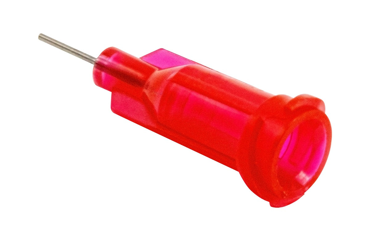 Die 25-Gauge-Dosiernadel verfügt über eine hochwertige Edelstahlkanüle mit einer Länge von 1/4” (6,35 mm) und einem Auslass mit Innendurchmesser Ø0,25 mm. Der Polypropylen-Körper ist rot zur klaren Größenkennzeichnung codiert und mit einem standardisierten Luer-Lock-Anschluss ausgestattet, der eine sichere und dichte Verbindung zu gängigen Dosier- und Applikationssystemen gewährleistet.